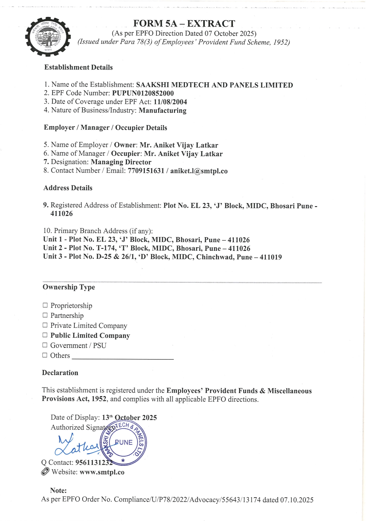 Saakshi Medtech and Panels Ltd. was founded in 2001 by Mr Vijay Latkar a technocrat and a veteran General Electric employee who had held a variety of management positions during his tenure with the company.