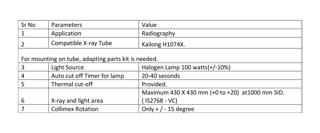 This X-ray Collimator is used with an X-ray tube to restrict and define the area covered by the X-ray beam and also to reduce radiation. The X-ray field dimension is able to be adjusted manually, the Collimator is designed and constructed within the specification imposed within practical limitations to provide protection against all unwanted X-ray radiation emissions.